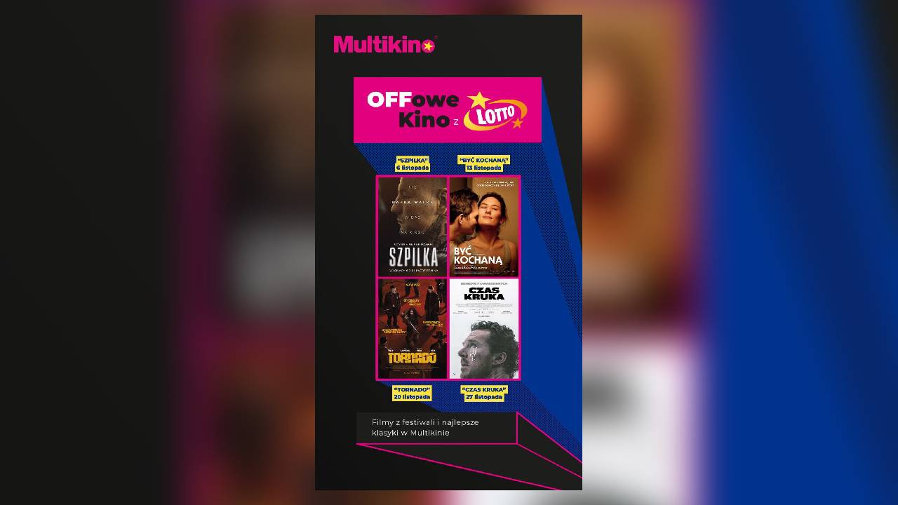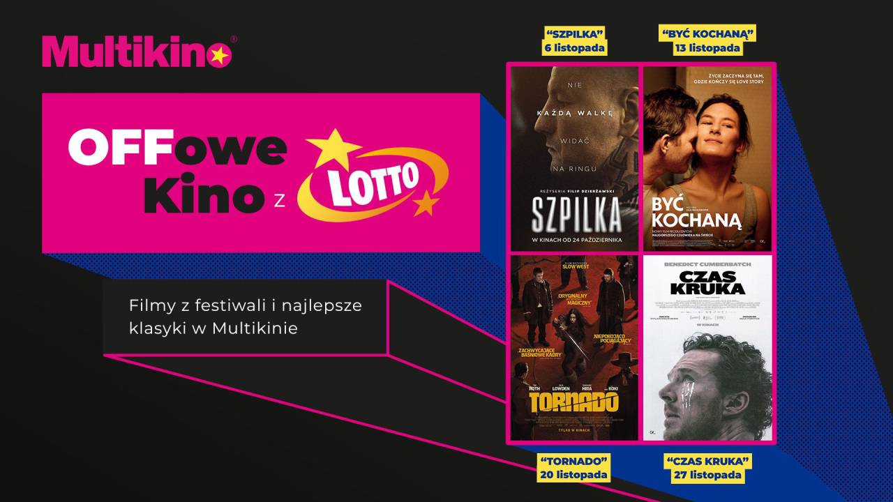 Projekt „OFFowe Kino z Lotto” w listopadzie ponownie wzbogaci regularny repertuar o filmy festiwalowe i artystyczne produkcje. 6 listopada we wszystkich kinach sieci Multikino będzie można zobaczyć film dokumentalny „Szpilka”, 13 listopada „Być kochaną”, 20 listopada „Tornado”, a 27 listopada „Czas kruka”.