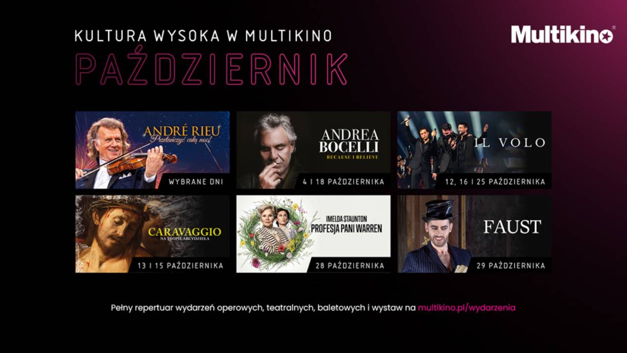 12, 16 i 25 października widzowie zobaczą wielkie show trzech utalentowanych młodych Włochów, którzy z powodzeniem łączą operę i muzykę popularną: „Il Volo: Najnowszy koncert z Doliny Świątyń”. Natomiast 4 i 18 października w Multikinie będzie można zobaczyć dokument „Because I Believe”. Widzowie będą podążali za Andreą Bocellim nie tylko za kulisy, ale również poza scenę, by zajrzeć do jego prywatnego życia – wśród rodziny i najbliższych przyjaciół.