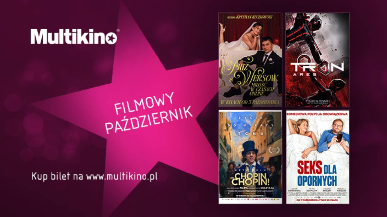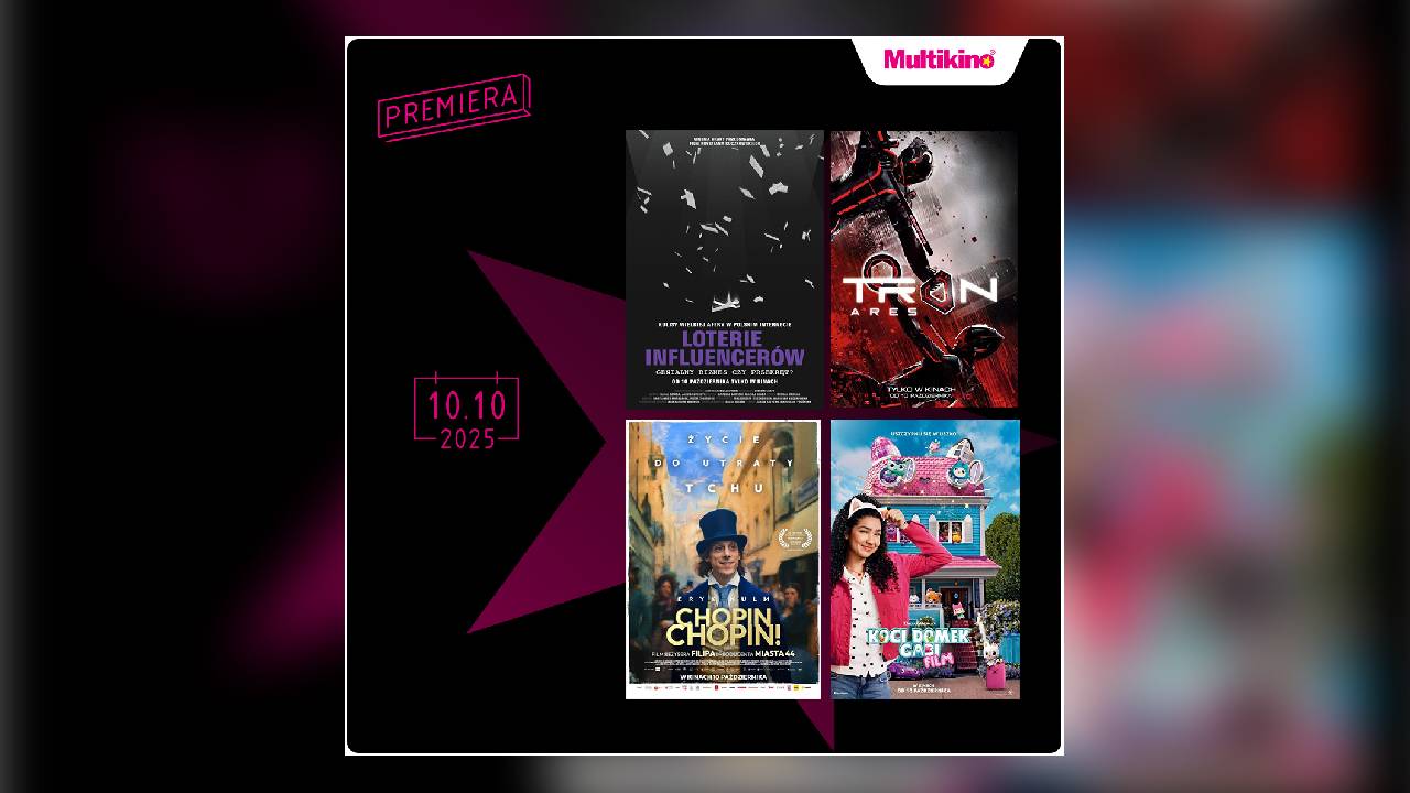 Od 10 października na widzów w kinach sieci Multikino będą czekały aż cztery premierowe propozycje – „TRON: Ares” z Jaredem Leto, „Chopin, Chopin!” z Erykiem Kulmem, dokument „Loterie influencerów” oraz produkcja familijna „Koci domek Gabi”. Szczegółowy repertuar jest dostępny na stronie www.multikino.pl.