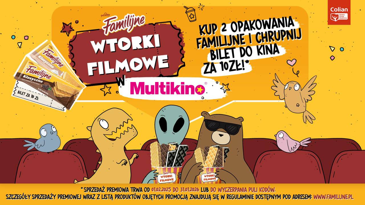 „Familijne wtorki filmowe” to doskonała okazja do tego, żeby zapomnieć o jesienne aurze i wybrać się do kina na najnowsze filmowe premiery w bardzo korzystnej cenie. W celu skorzystania z promocji wystarczy zakupić jeden z produktów marki Familijne na przykład: Familijne wafle klasyczne o smaku śmietankowym lub Familijne wafle gofrowe o smaku czekoladowym. Następnie na stronie familijne.pl należy wypełnić zamieszczony formularz zgłoszeniowy załączając między innymi dowód zakupu (skan paragonu lub faktury). Po wysłaniu formularza i pozytywnej weryfikacji uczestnik akcji otrzyma smsem na podany wcześniej numer telefonu kod promocyjny uprawniający do odbioru we wtorek biletu zł w wybranym kinie sieci Multikino.