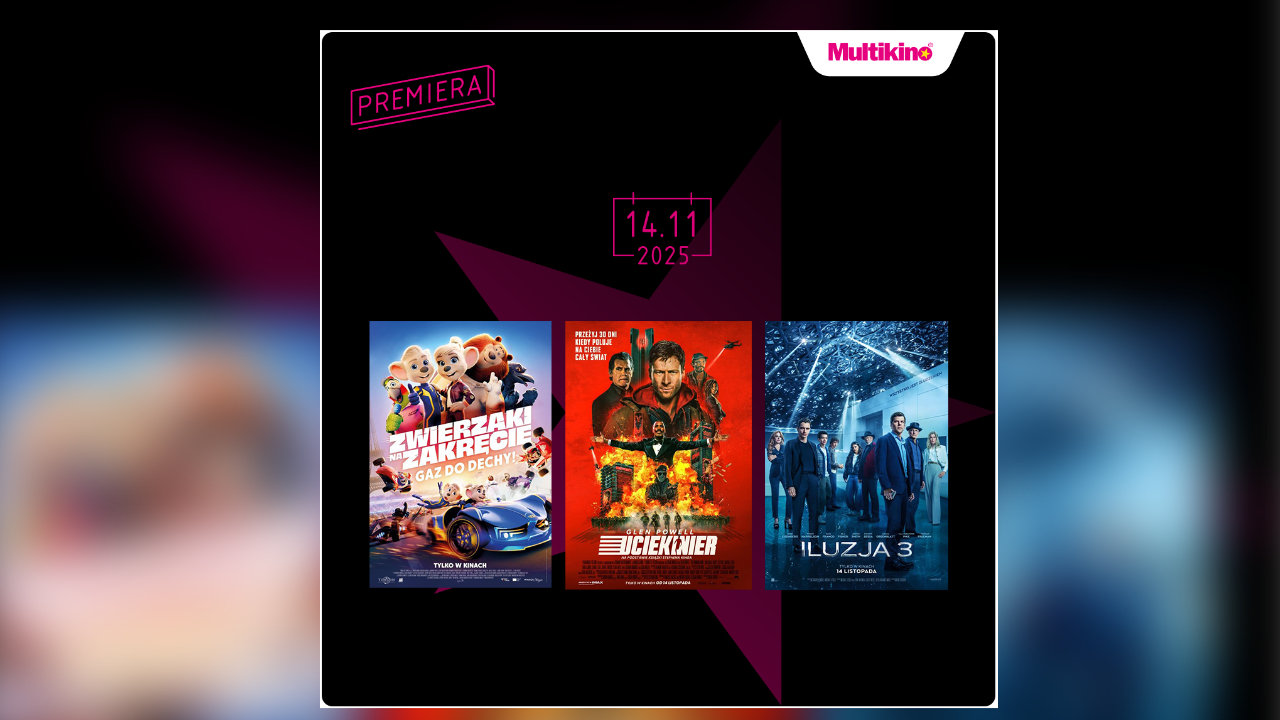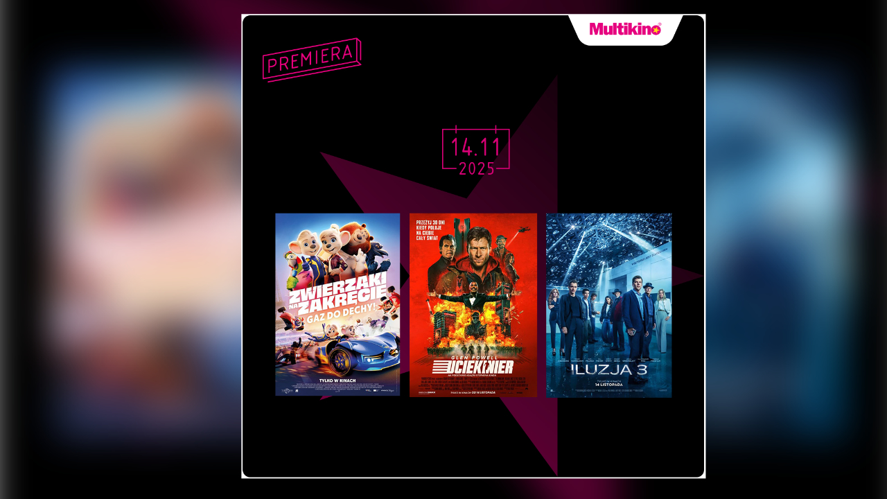 Od 14 listopada na widzów w kinach sieci Multikino będą czekały aż trzy premierowe propozycje – „Iluzja 3”, czyli kontynuacja uwielbianego hitu, w którym powrócę Czterej Jeźdźcy, „Uciekinier” z Glenem Powellem oraz produkcja familijna „Zwierzaki na zakręcie” . Szczegółowy repertuar jest dostępny na stronie www.multikino.pl.
