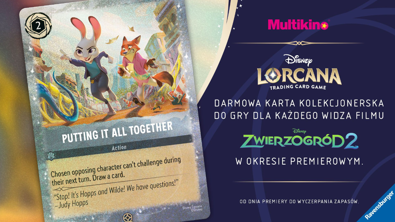 Disney Lorcana to karciana zabawa, która pozwala graczom na zbieranie, wymianę i rozgrywanie pojedynków z użyciem specjalnych kart. Każda karta reprezentuje postać, przedmiot lub zdolność, która może być wykorzystana podczas gry. Osoby, które przyjdą do Multikina na animację Disney’a między 26 a 30 listopada w kasie kina mogą odebrać kolekcjonerską kartę Zwierzogród z Disney Lorcana. Karty będą rozdawane do wyczerpania zapasów.