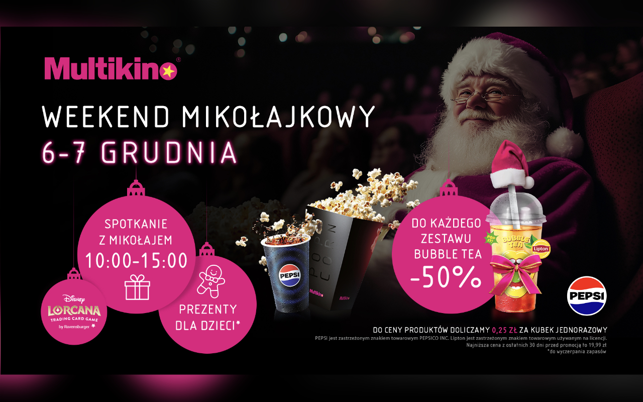 Początek grudnia 2025 roku zapowiada się wyjątkowo. Dzieci czekają dwa dni pełne radości i filmowych przygód, czyli mikołajkowy weekend w Multikinie! Każda z magicznych premier zabierze najmłodszych do niezwykłych światów, tworząc niezapomniane wspomnienia. Ponadto w sobotę 6 grudnia i w niedzielę 7 grudnia od 10.00 do 15.00 w wybranych kinach sieci Multikino będzie czekał Mikołaj z prezentami dla dzieci. Będą one rozdawane małym kinomanom do wyczerpania zapasów. Ponadto 6 i 7 grudnia do wybranych zestawów* w popcornbarze będzie można zakupić dowolną Bubble Tea z Lipton 0,5l z 50% zniżką**.