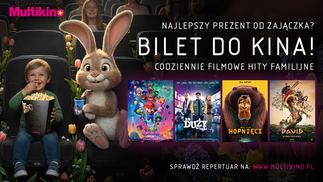 Wielkanoc to doskonały moment, by spędzić czas w gronie najbliższych, także poza domem. Sieć Multikino zaprasza na familijne seanse, które umilą świąteczne dni i dostarczą rozrywki zarówno najmłodszym, jak i dorosłym widzom. W repertuarze przedpremierowo „Super Mario Galaxy Film”, ale też uwielbiane pozycje ostatnich tygodni: animacje „Hopnięci” oraz „David”, a także polska produkcja „Za duży na bajki 3”.