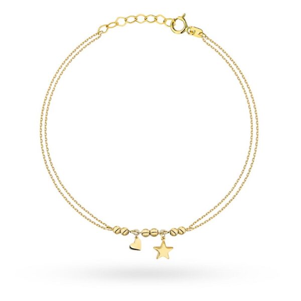 Złoto 585 – Podaruj wyjątkowy prezent z okazji Dnia Kobiet! Ta delikatna, złota bransoletka na podwójnym łańcuszku to połączenie subtelnego blasku i symboliki. Gładkie kulki dodają jej elegancji, serce symbolizuje miłość i bliskość, a gwiazdka przypomina o marzeniach i sile, która drzemie w każdej kobiecie. Lekka, kobieca i ponadczasowa